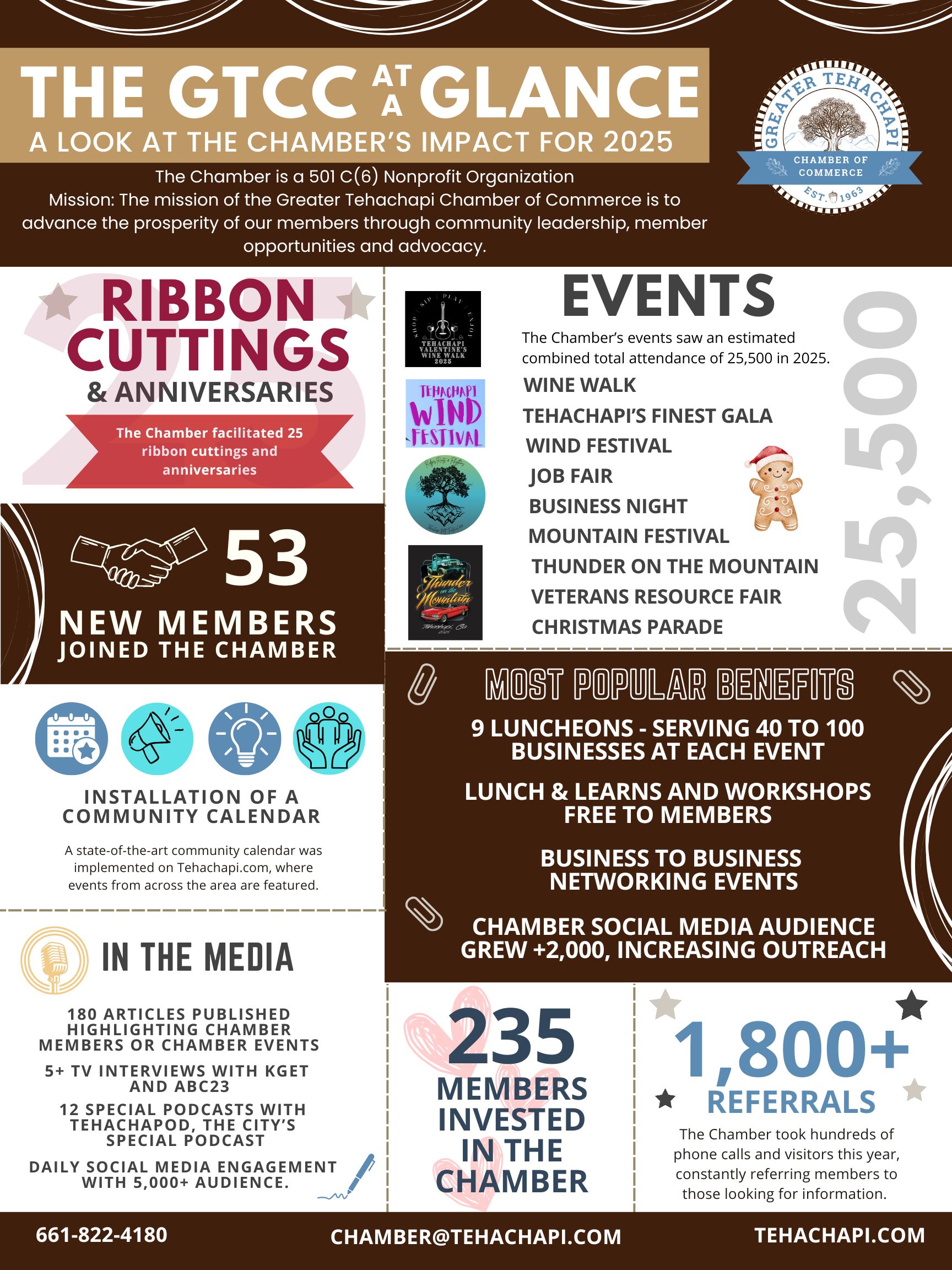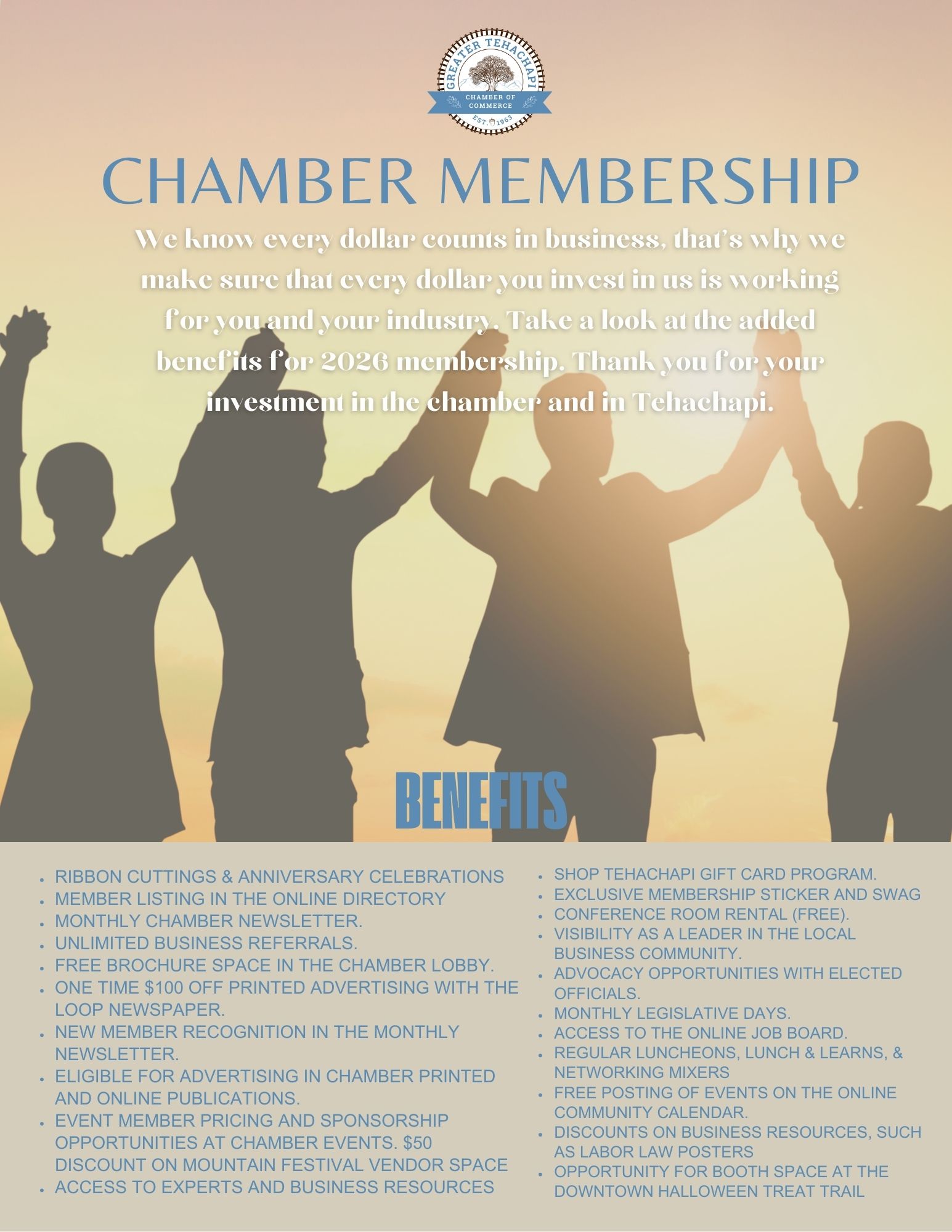 Contact the Chamber for more information about membership and to get an application. 661-822-4180. chamber@tehachapi.com